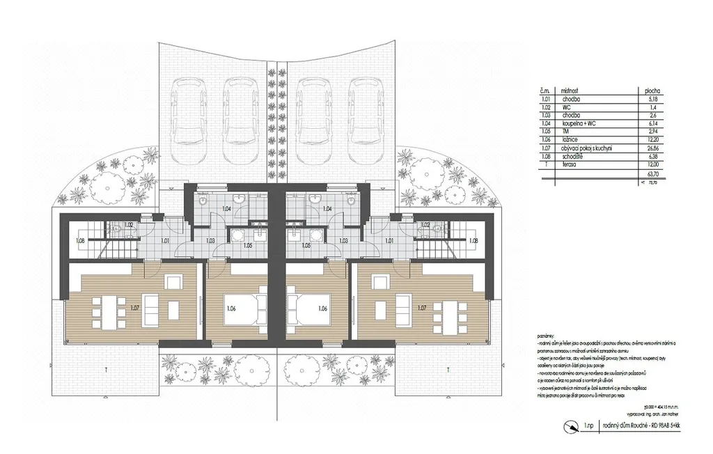 Dispozice: 1.NP - vstupní chodba (7,78m2), koupelna se sprch. koutem, umyvadlem a WC (6,14m2), WC (1,4m2), technická místnost (2,94m2), pokoj (12,20m2), obývací pokoj s kuchyňským koutem (26,86m2), chodba se schodištěm (6,38). Z obýváku je vstup na terasu o výměře 12m2. Plocha parkovacího stání pro 2 auta 36m2.