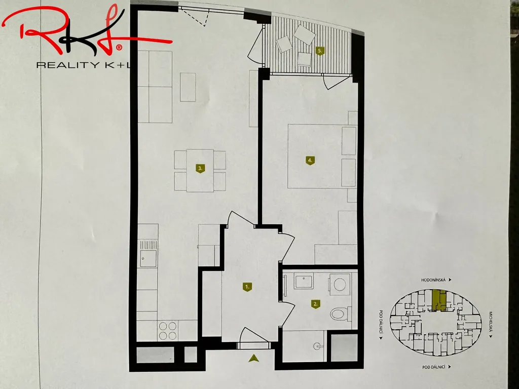 Byt v rezidenci Oliva, dispozice 2+kk, se nachází v 6. patře bytového domu na ulici Hodonínská. Výměra bytu je 55,2 m² + lodžie 4,3 m².