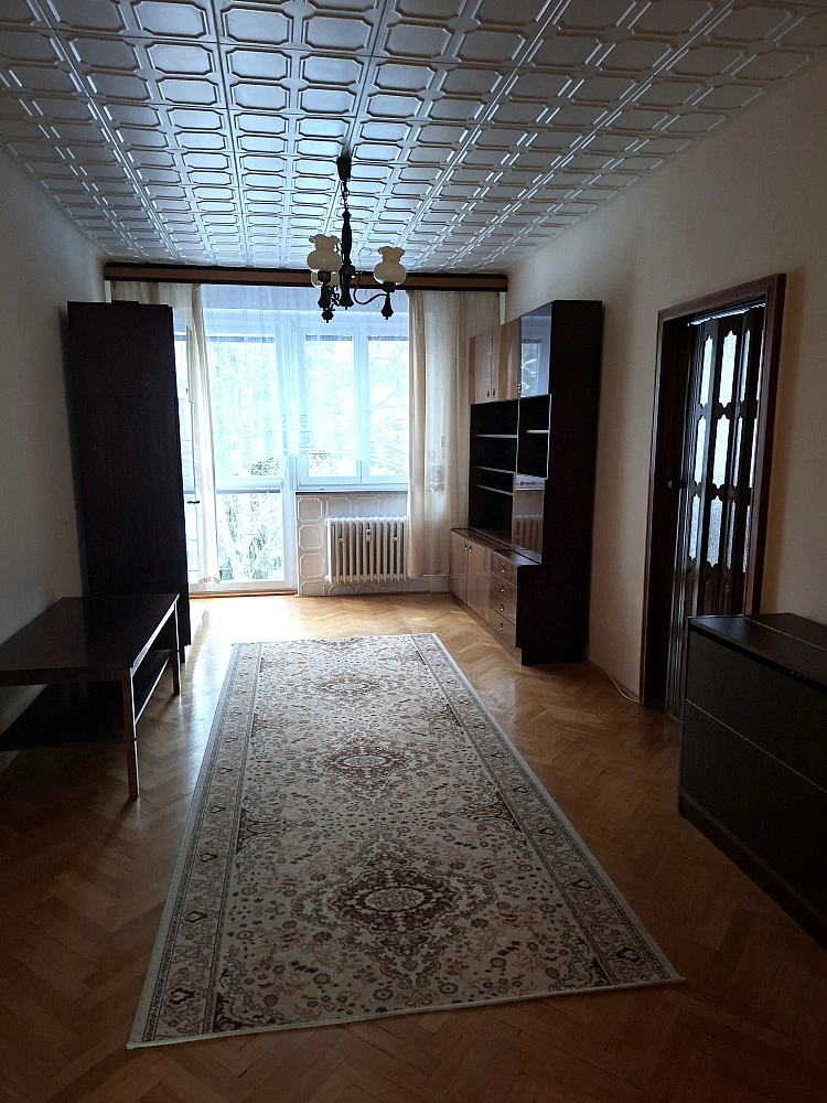 Byt má v chodbě starší vestavěné skříně, koupelna s menší vanou a pračkou, wc samostatně, zařízená kuchyň (není myčka) s lodžií do ulice, částečně zařízený další pokoj s lodžií také do ulice, dále částečně zařízený prostorný obývák s lodžií orientovanou do klidu a zeleně, zařízená ložnice bez lodžie. Všechny pokoje neprůchozí kromě ložnice, do které se vstupuje z obýváku.K bytu náleží sklepní kóje umístěná v suterénu domu.