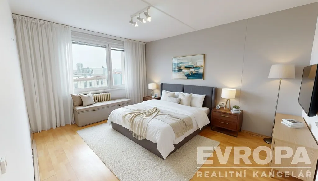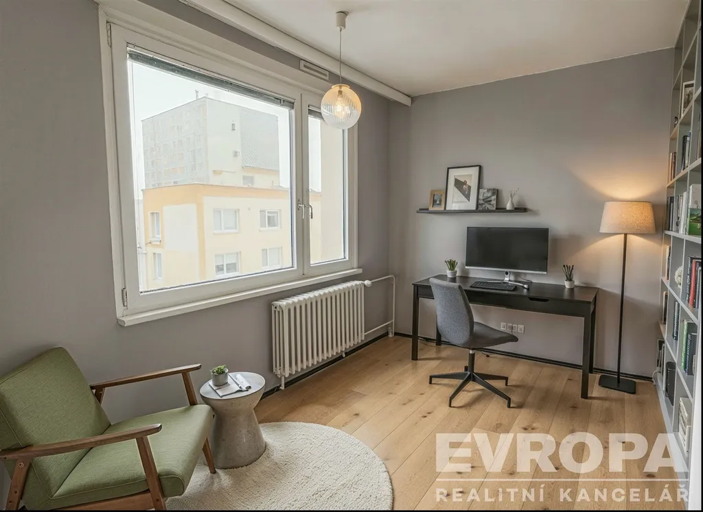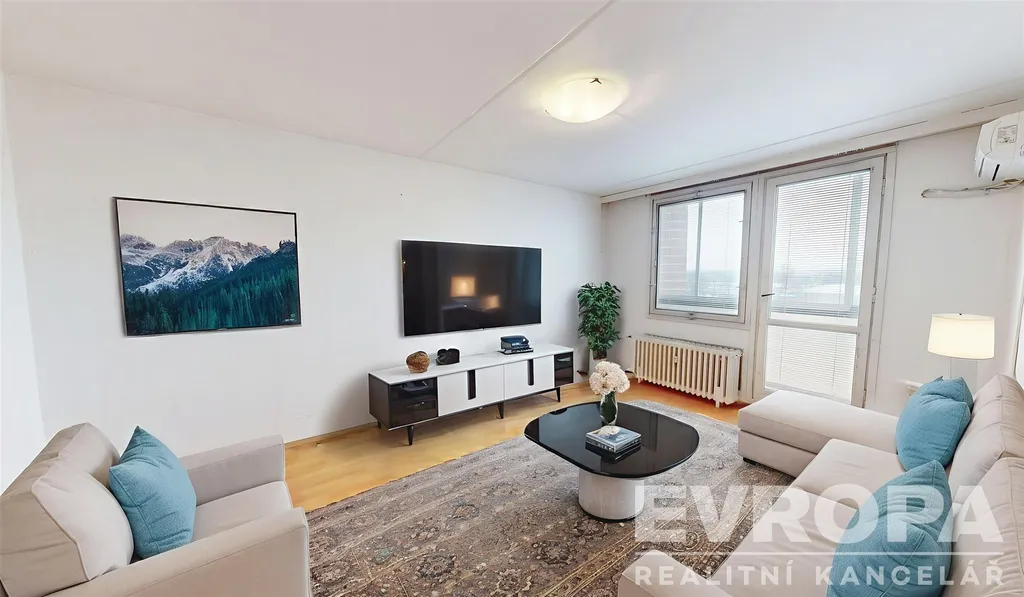 Dispozice tvoří pět samostatných pokojů a kuchyně, což nabízí dostatek prostoru pro vícečlennou domácnost, pracovnu i pokoj pro hosty. Okna jsou orientována na sever, východ a jih, byt je tak přirozeně světlý během celého dne. Obývací pokoj orientovaný na jih navazuje na zasklenou lodžii, která příjemně rozšiřuje obytný prostor. Součástí obývacího pokoje je klimatizační jednotka.