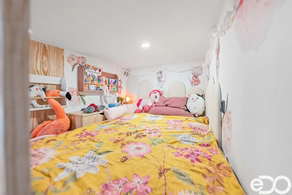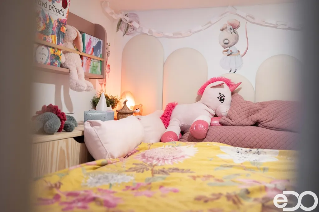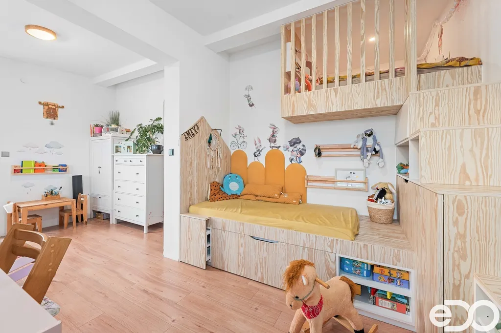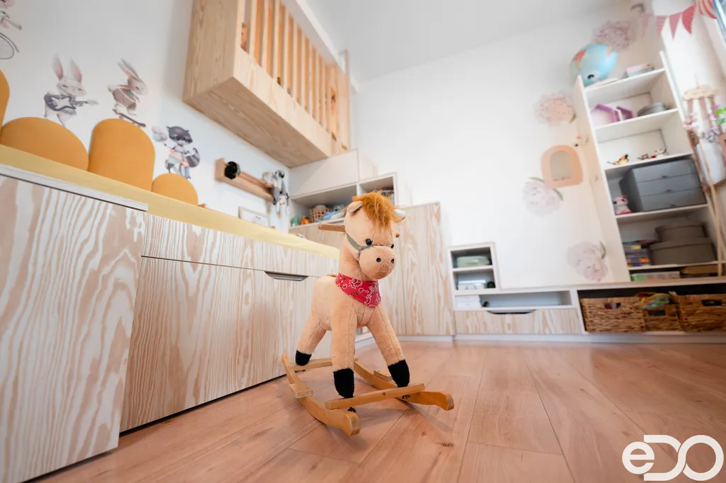Dětský pokoj nabízí nábytek na míru včetně vestavby patrového spaní. Komfort doplňují elektrické venkovní žaluzie s ovládáním Somfy a sítě proti hmyzu ve vybraných oknech.