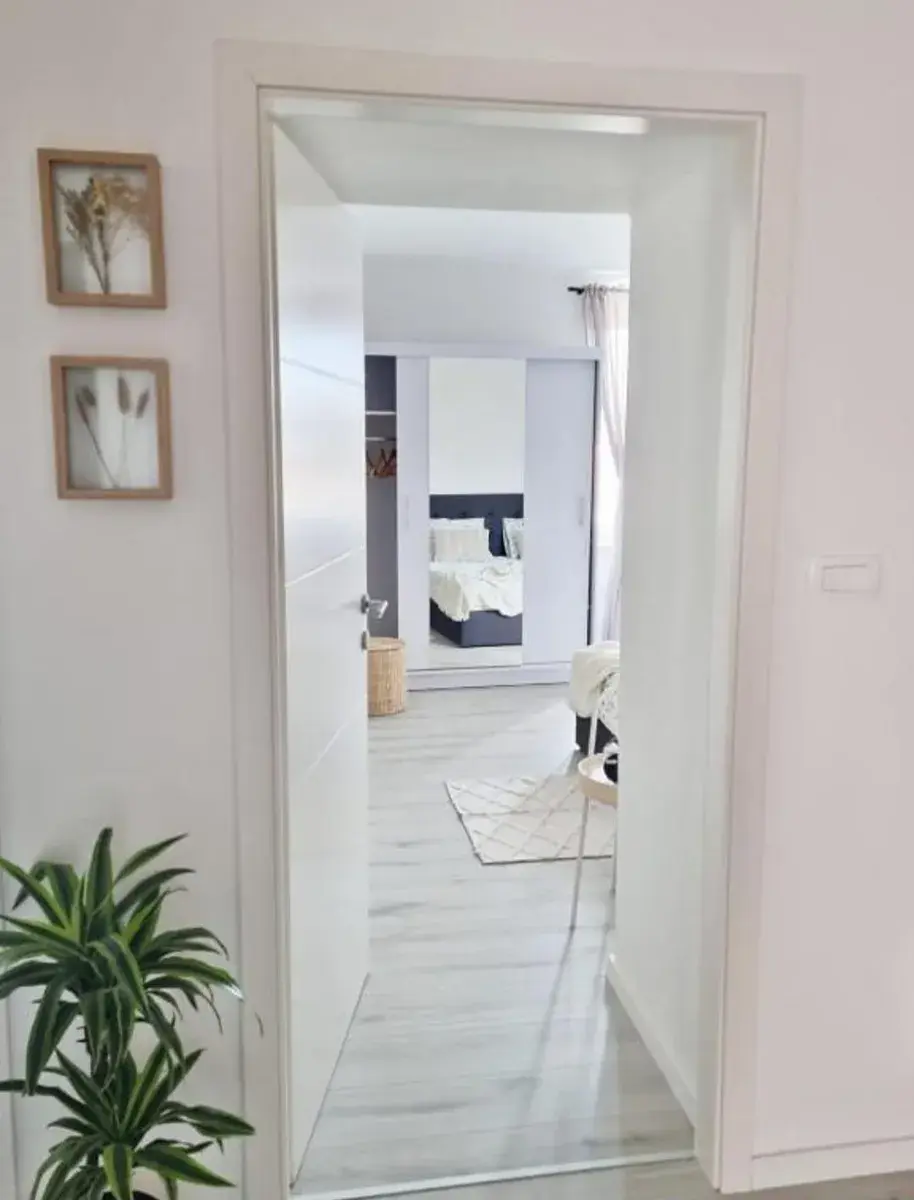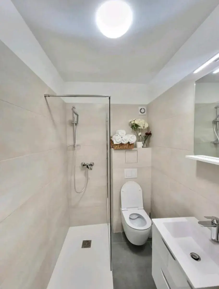 Obývací pokoj je velmi světlý a příjemný, vybavený velkou rohovou sedačkou, televizí a zrcadlem – ideální místo k odpočinku po dni stráveném objevováním města. Koupelna je rovněž kompletně zrekonstruovaná, s moderní sanitou a kvalitními materiály.