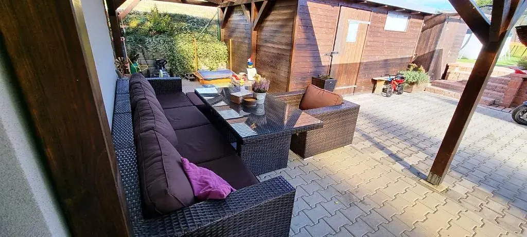 Na zahradě najdete prostornou terasu ideální k posezení i grilování a dva zahradní domky, z toho jeden zateplený o velikosti 15 m².