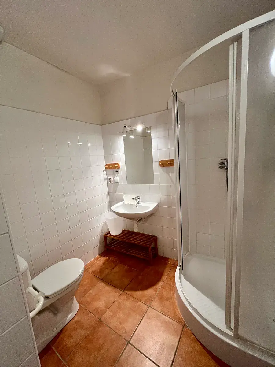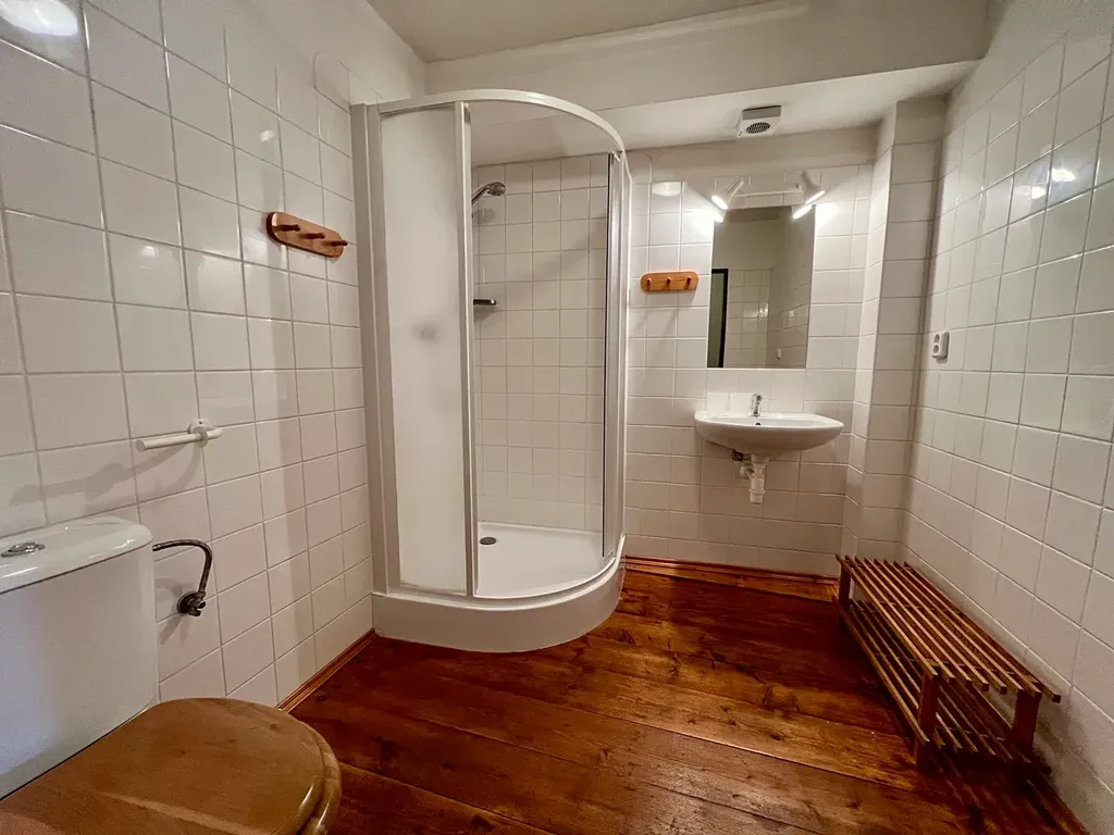 První patro je ryze pro ubytované hosty a disponuje 2 ložnicemi s vlastní koupelnou (obě se 3 lůžky) a rodinným apartmánem s koupelnou a dvěma ložnicemi (1 dvoulůžková a 1 čtyřlůžková s postelí a palandou).