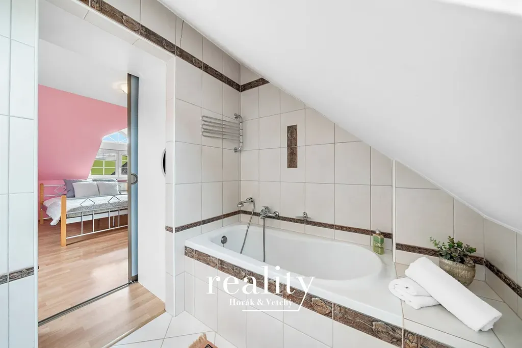 V 1. patře je obývací pokoj s krbem, kuchyň s jídelnou a obývacím koutem, romantická ložnice s přilehlou koupelnou skrytou za šatní skříní. Dále ložnice, samostatná koupelna a komora.