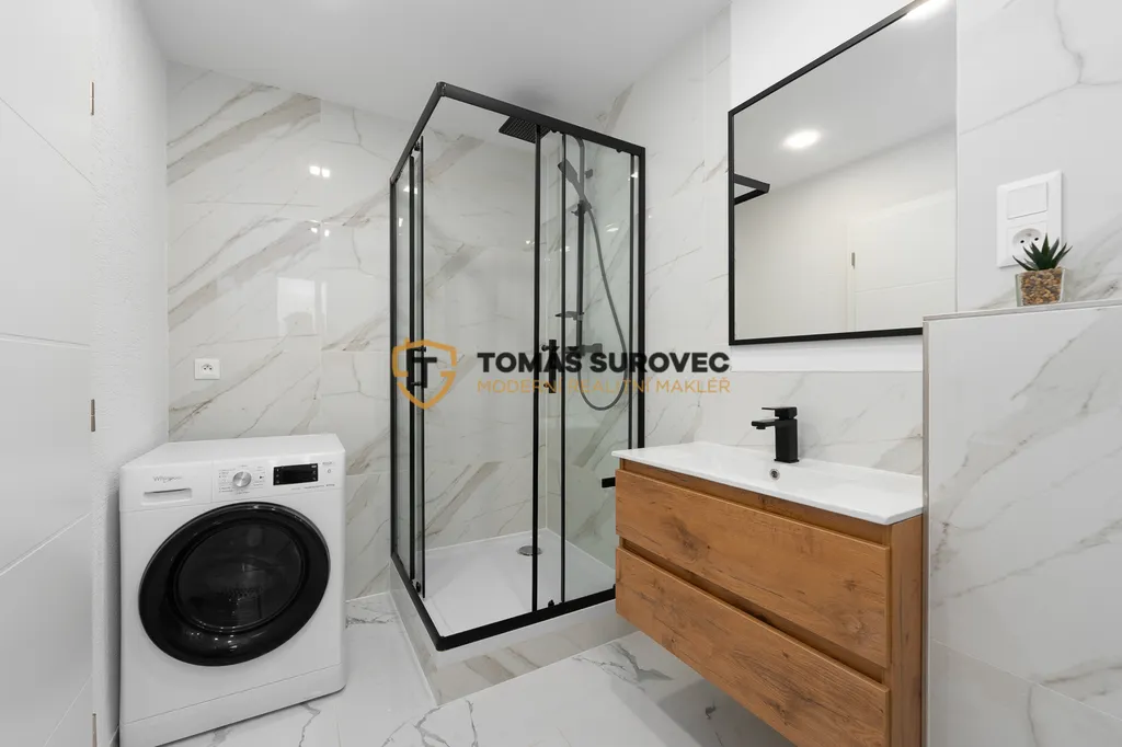 Koupelna nabízí sprchový kout a dostatek místa pro pračku – která tu také zůstává, takže si nemusíte nic dokupovat. Byt se nachází ve čtvrtém patře bez výtahu, což zajišťuje klidné bydlení a výhledy do okolí.