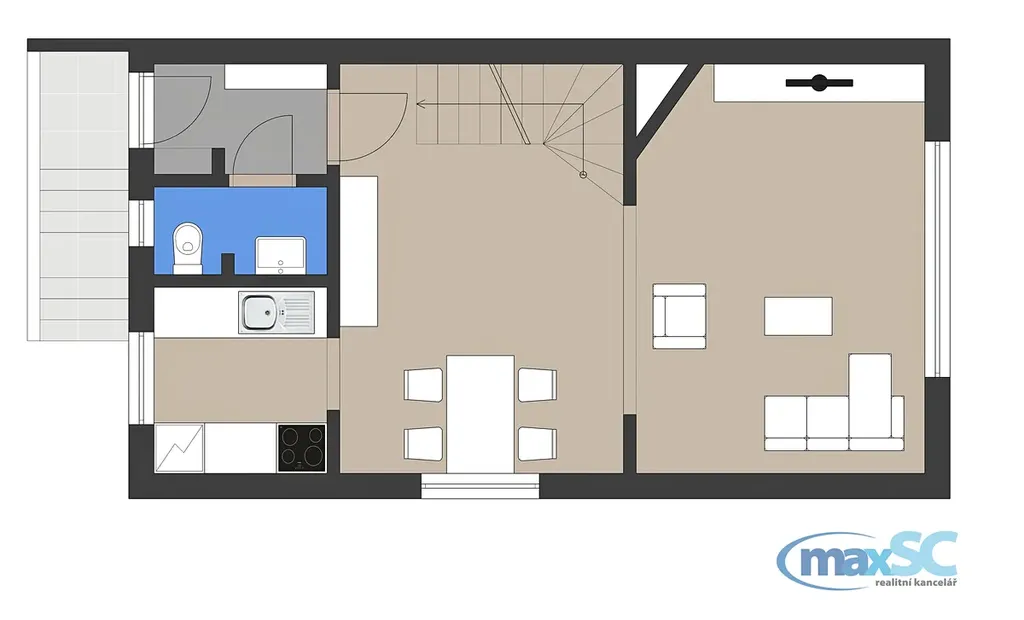1. nadzemní, kde je umístěn vchod do obytné části, s chodbou WV, malou kuchyňkou a prostorným obývacím pokojem s jídelnou