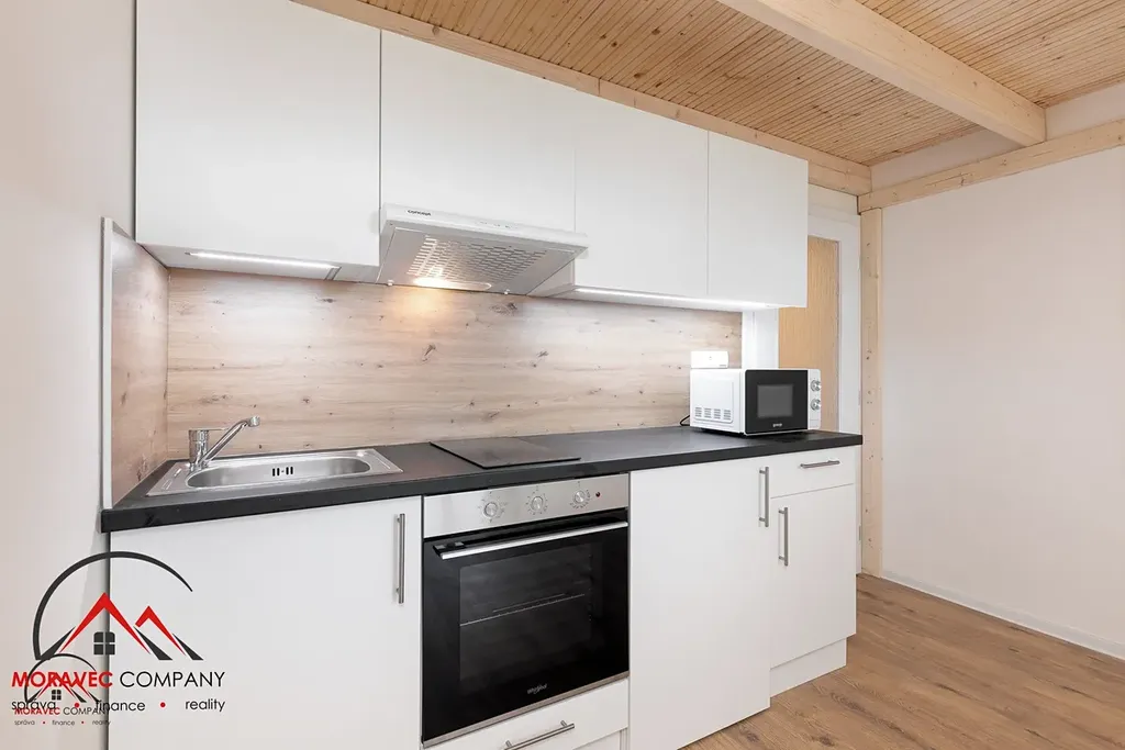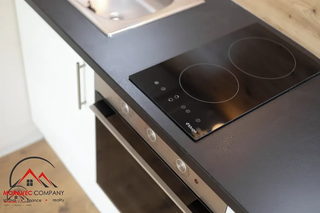 Vybavení bytu zahrnuje kuchyň s elektrickou troubou, indukční varnou deskou, digestoří, mikrovlnkou a zabudovanou lednicí. Koupelna je vybavena sprchovým koutem, pračkou a WC. Ohřev vody zajišťuje elektrický bojler.