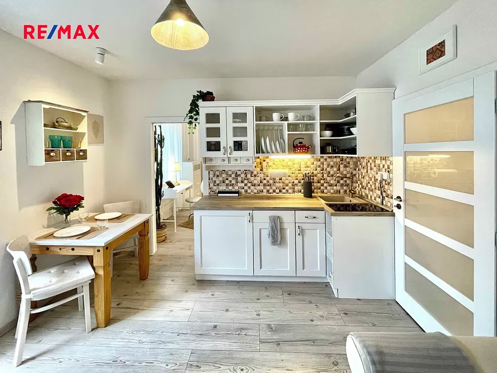 Dominantou tohoto bytu je zařízený pokoj s kuchyňským koutem vybaveným linkou a veškerými spotřebiči.