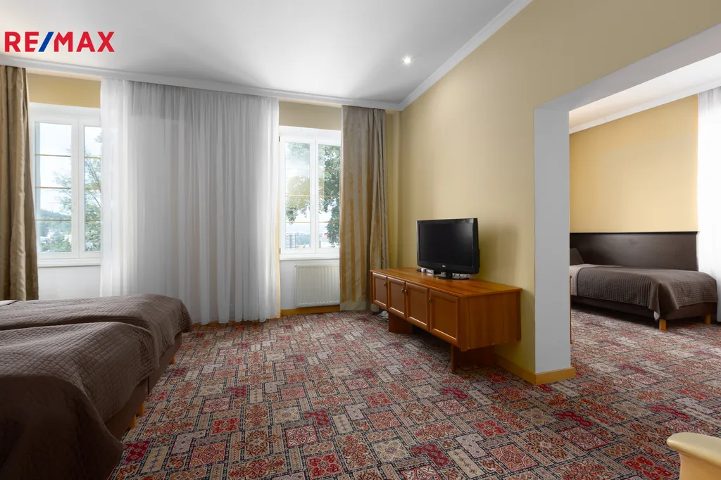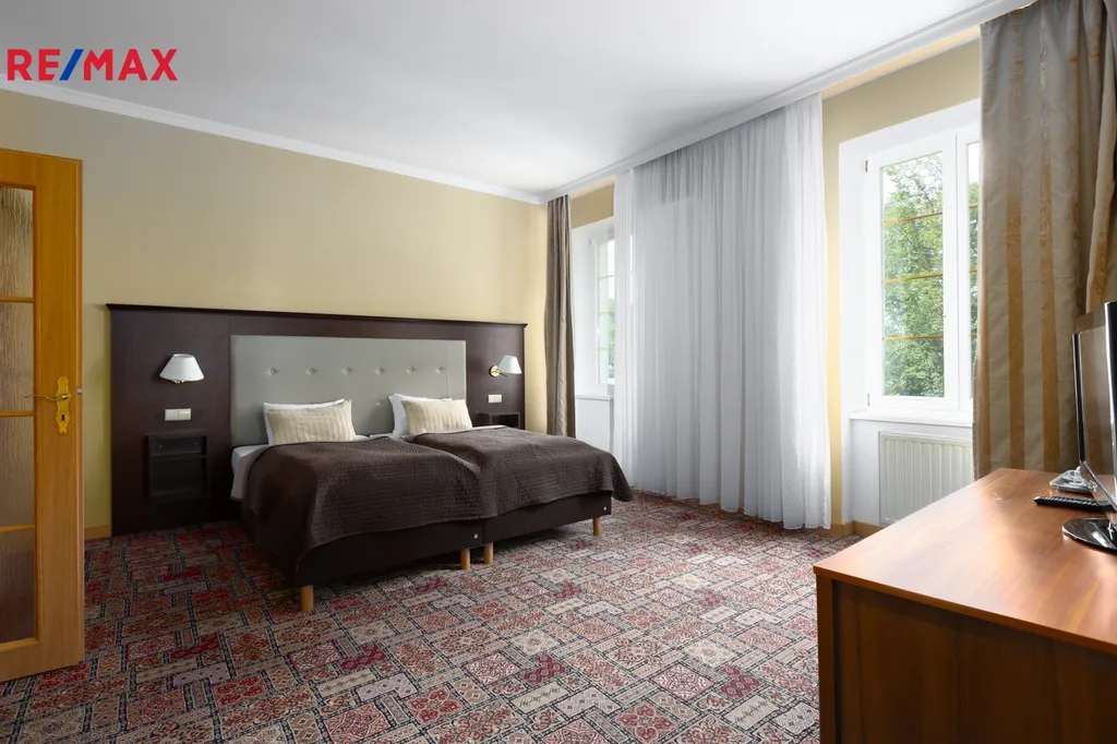 Pokoje a apartmány se nacházejí v prvním a druhém nadzemním podlaží. Podkroví nabízí dva samostatné byty a velkorysý nevyužitý prostor s již vypracovanou studií na rozšíření kapacity. Nový majitel tak může realizovat vlastní záměr – vybudovat další pokoje, apartmány či jiné provozní zázemí dle svých představ.