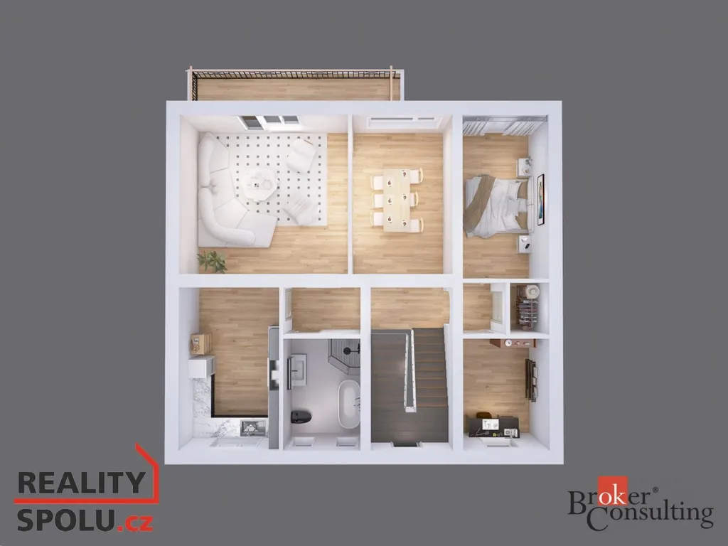Zde se nachází ložnice, dva samostatné pokoje, samostatná toaleta a koupelna se sprchovým koutem.