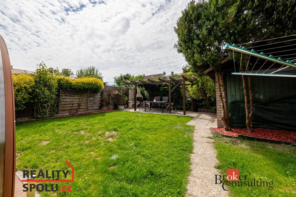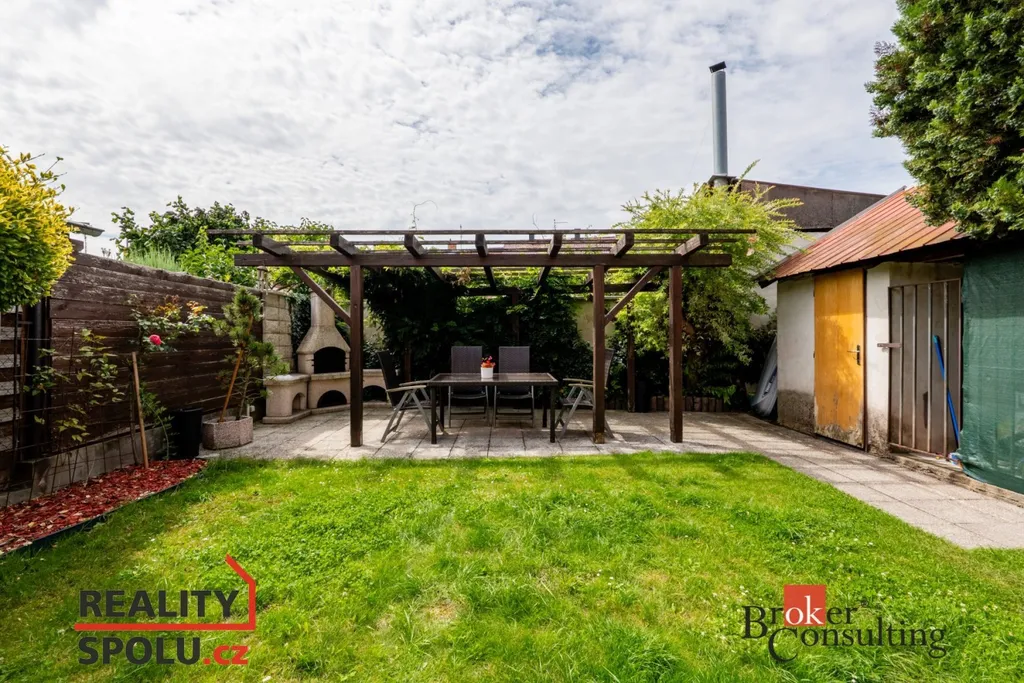 Na zahradu je přístup průjezdem nebo po schodišti z balkonu. Najdete zde zastřešenou vířivku, pergolu s krbem pro příjemné posezení v létě a dřevěný domek na zahradní náčiní.