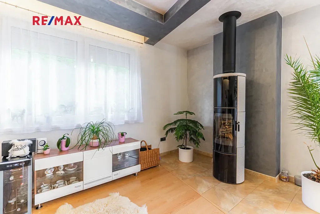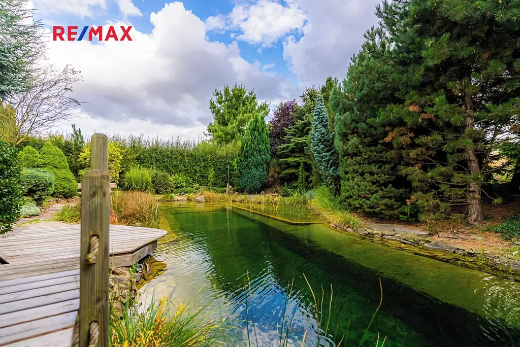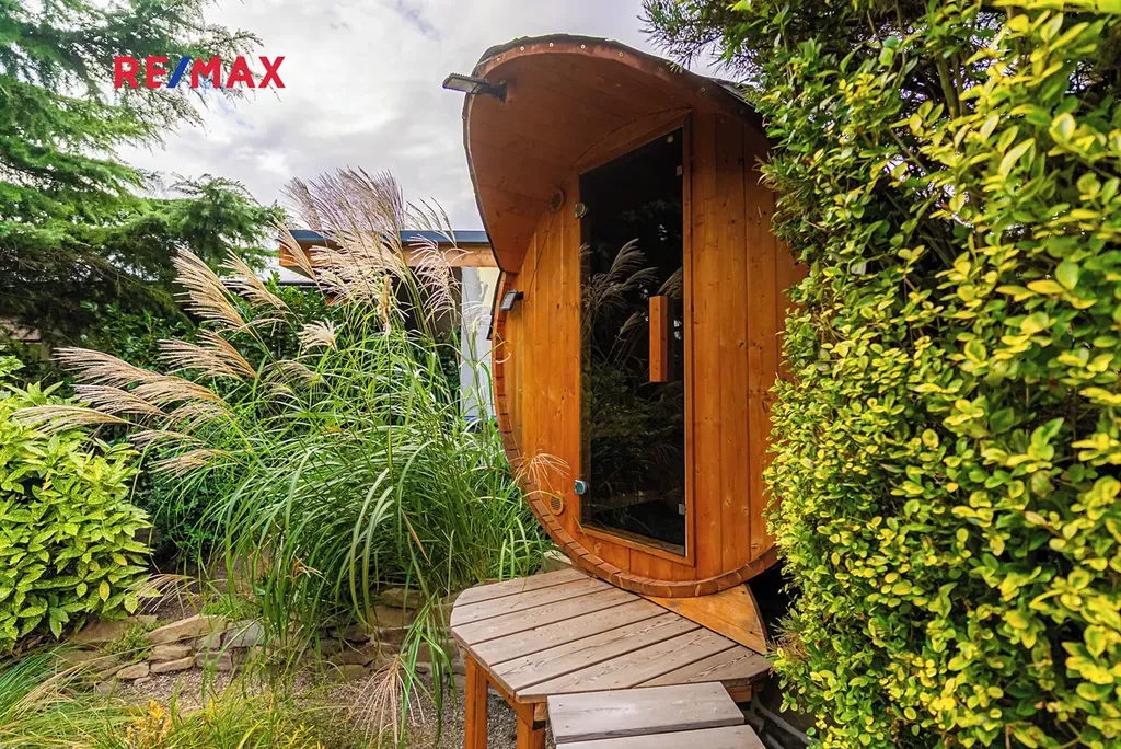 Největší předností je zahrada orientovaná na jihozápad, kde si vychutnáte slunce od odpoledne až do večera. Dominantou pozemku je velké koupací jezírko – biotop (cca 17 × 4 m), které slouží nejen k osvěžení, ale i k plavání. Atmosféru doplňuje finská sauna, venkovní gril a vzrostlé stromy – cedr, borovice, smrk i jedle. Na zahradě je automatické zavlažování a vlastní studna.