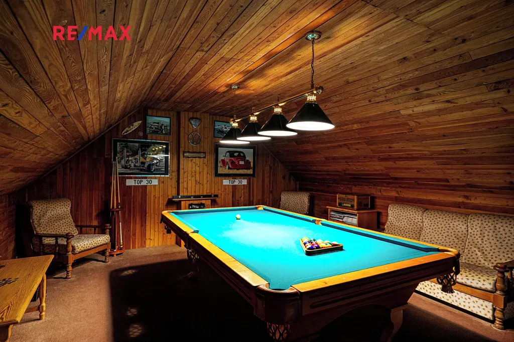 K domu náleží garáž pro jeden vůz a v patře garáže se nachází společenská místnost s kulečníkem pro přátelské turnaje.