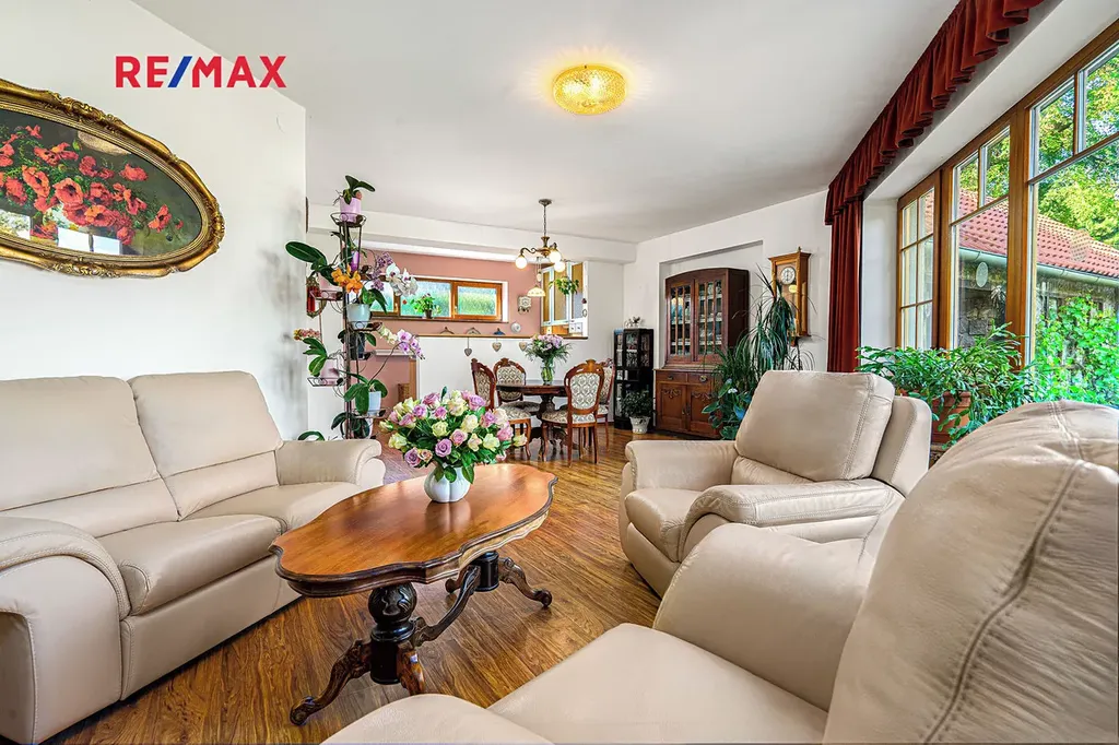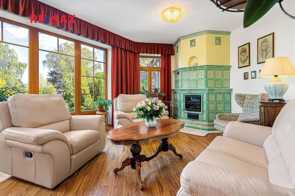 Hlavní místností prostorného rodinného domu je obývací pokoj s kuchyní a s krásnými kachlovými kamny, která zejména v chladných měsících vybízí k příjemného posezení za zvuku praskajícího ohně. Z obývacího pokoje je pak nádherný výhled a přímý vstup do pohádkové zahrady.