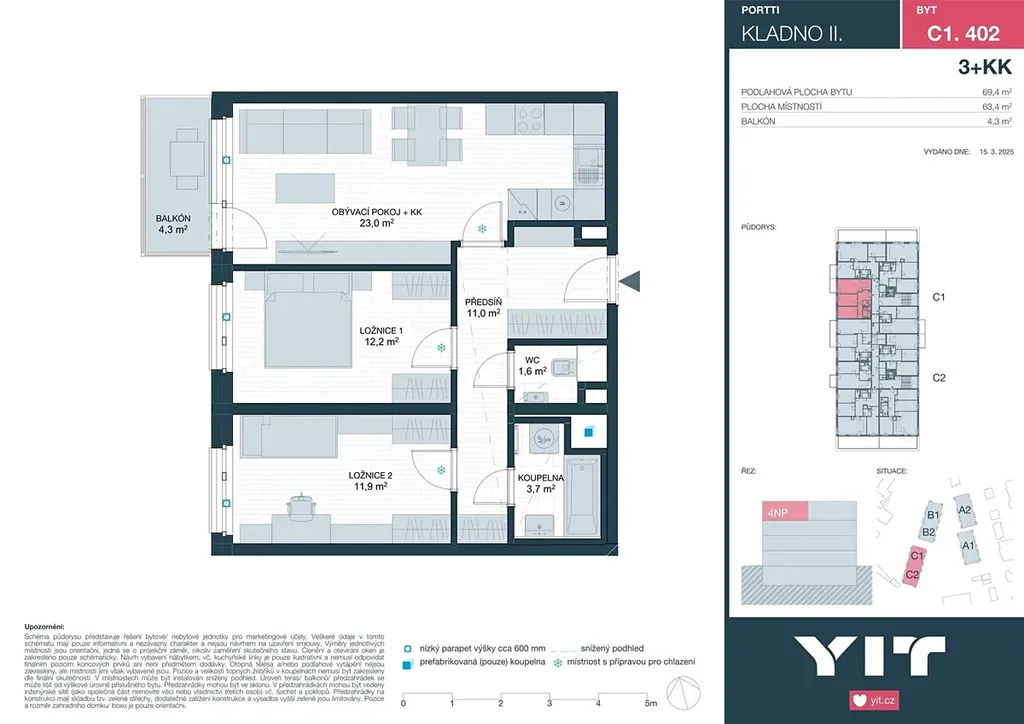 Byt 3+kk o celkové rozloze 69,4 m² s balkónem 4,3 m² je situován v 4.NP projektu PORTTI Kladno II. Cena zahrnuje bytovou jednotku, sklepní kóji a DPH. K bytu náleží i parkovací stání, které není zahrnuto v ceně. Cena parkovacího stání od 448 000 Kč včetně DPH.