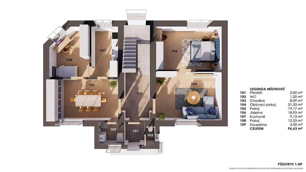 Dům je zároveň vhodný jako klasické rodinné sídlo pro větší rodinu nebo dvougenerační bydlení. Současná dispozice (4+1 v přízemí a 4+kk v patře) nabízí komfortní oddělení dvou domácností při zachování soukromí. Podkroví s dostatečnou světlou výškou umožňuje další rozšíření obytné části.
