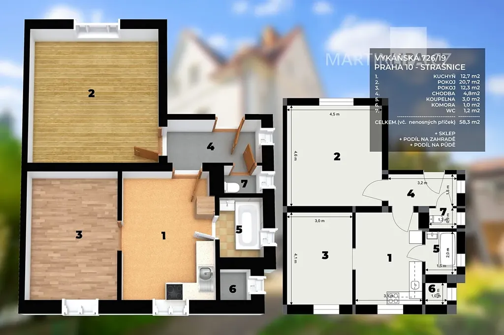 Strašnice. Klidná vilová čtvrť, pár kroků od centra Prahy a přesto úplně jiný svět. Ve Vykáňské ulici stojí dům se třemi bytovými jednotkami a v jeho prostředním, tedy druhém podlaží se právě prodává byt o dispozici 2+1 a velikosti 58,3 m².