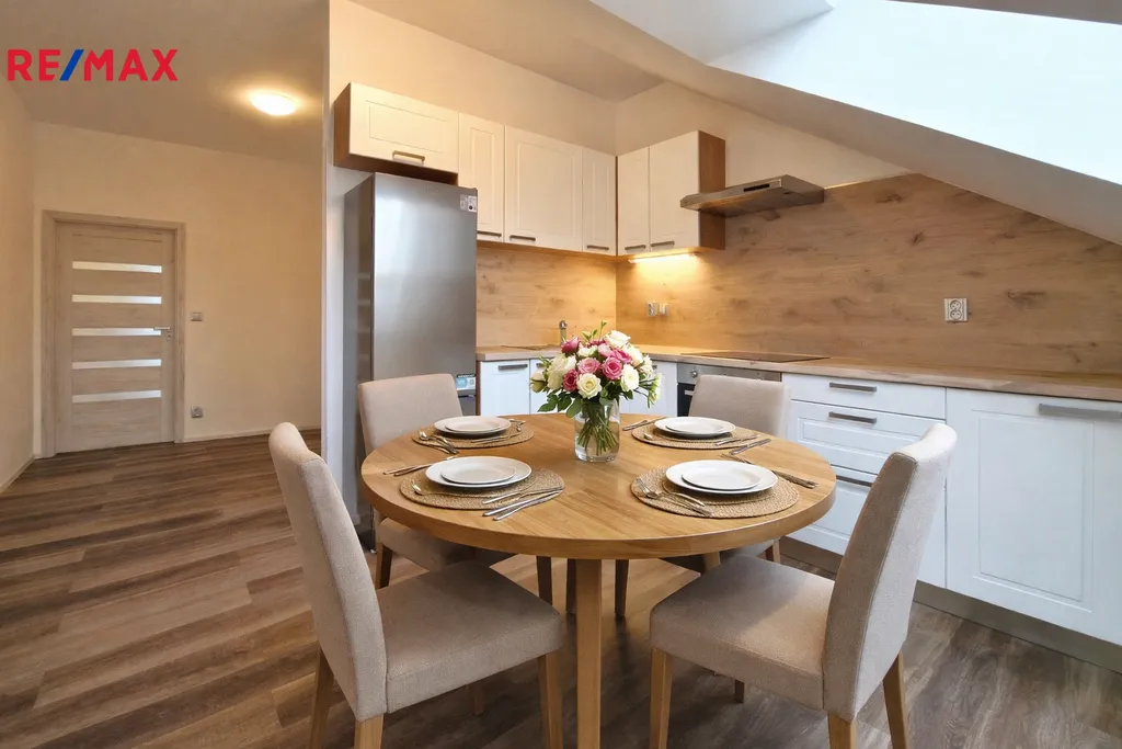 Byt tvoří vstupní předsíň (7,6 m2), ložnice (10,5 m2), obývací pokoj + kk (21,5 m2), pokoj (14,3 m2) a koupelna se sprchovým koutem, umyvadlem a wc (8,1 m2). Moderní komfortní kuchyňská linka je vybavená myčkou, ledničkou s mrazákem a digestoří. Dveře i obložkové zárubně jsou v dekoru dřeva, střešní okna jsou kombinace dřevo/plast. Byt je vytápěn tepelným čerpadlem (vzduch/vzduch) a podlahovým topením. Na předsíni je umístěný elektrický kotel, ohřev vody zajišťuje bojler umístěný v koupelně. Po půdních výsuvných schodech, umístěných v předsíni se dostáváme do půdního prostoru, který představuje další velkorysé možnosti využití. Při rekonstrukci byl kladen velký důraz na protihlukovou izolaci – protihlukový sádrokarton, PUR, kročejová podlahová izolace.
