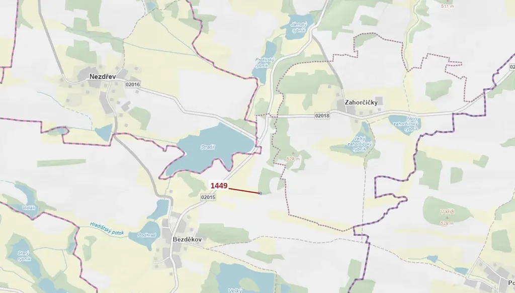 Lesní pozemek o výměře 638 m2, parcelní číslo 1449, podíl 1/1, katastrální území Bezděkov u Kasejovic, obec Hradiště, obec s rozšířenou působností Nepomuk, okres Plzeň-jih, Plzeňský kraj. Po těžbě.