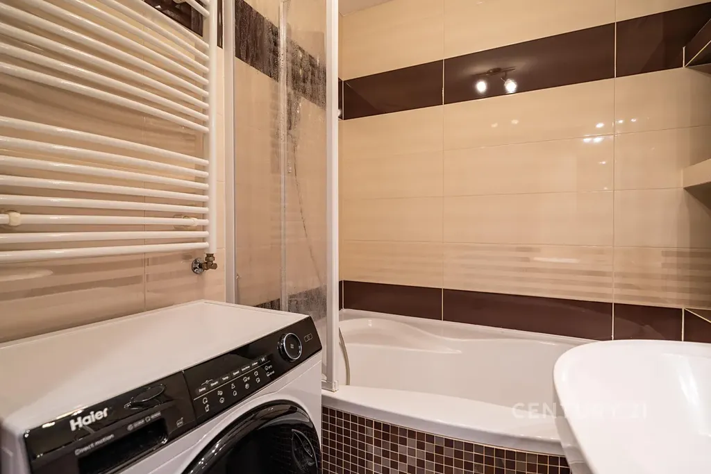 Koupelna a WC: Zděné jádro v moderním obkladu, v koupelně vana a nová pračka (pořízena 05/2025).