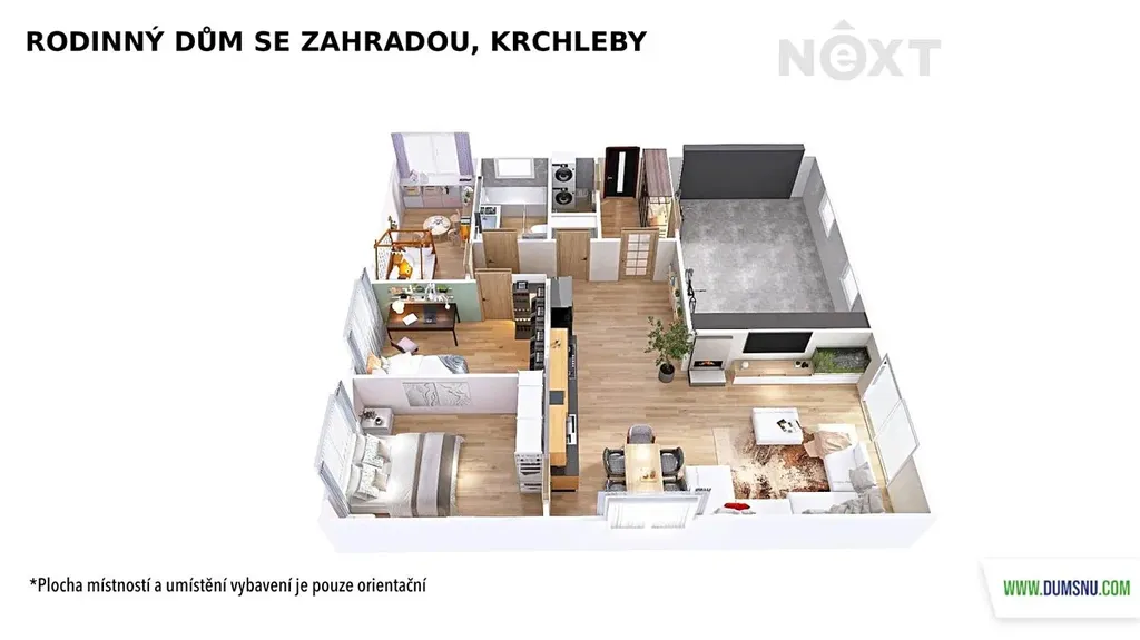 Dále zde naleznete samostatnou toaletu a moderní koupelnu vybavenou vanou i sprchovým koutem. K dispozici jsou také tři samostatné pokoje, které mohou sloužit jako ložnice, dětský pokoj nebo pracovna či studovna. Součástí domu je garáž a spíž, která poskytuje dostatek úložného prostoru.