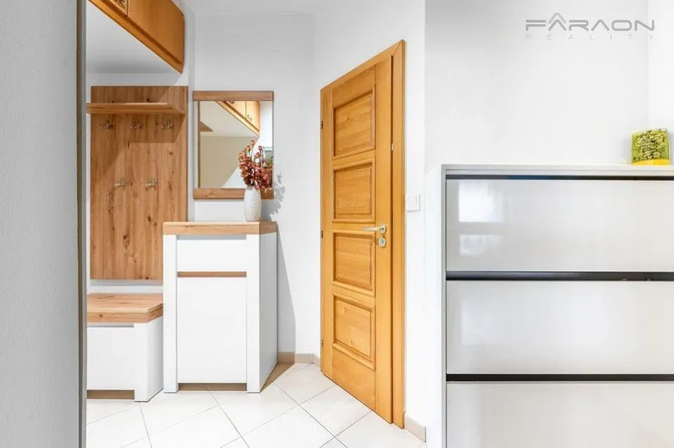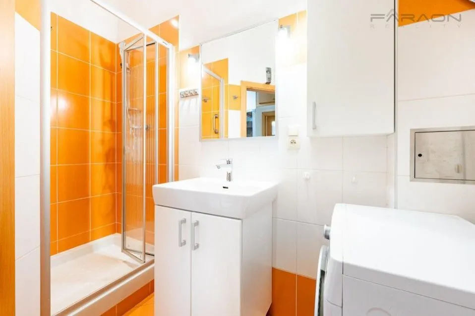 Kompletní vybavení byt, bezpečnostní vstupní dveře, žaluzie na všech oknech a mobilní klimatizace. Součást bytu je kompletně vybavená kuchyň se všemi spotřebiči. Dále je k dispozici pračka, sedací souprava, police a sestava skříněk v obývacím pokoji, postel a vestavěné skříně.