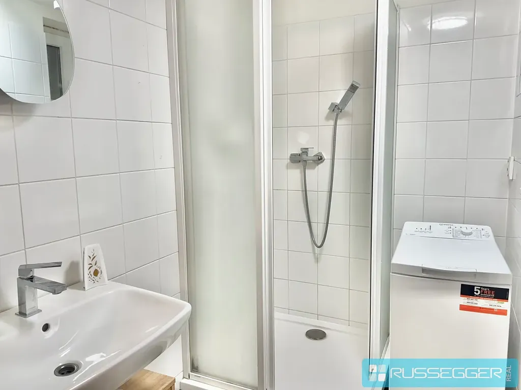 The apartment is located on the 2nd floor and comes fully equipped. The layout includes a bedroom with a bed, wardrobe, and additional storage space, as well as a living area with a kitchenette fitted with a kitchen unit, refrigerator, and induction hob. The bathroom features a shower and a washing machine, along with a separate toilet. A practical benefit is a separate pantry, providing extra storage space.