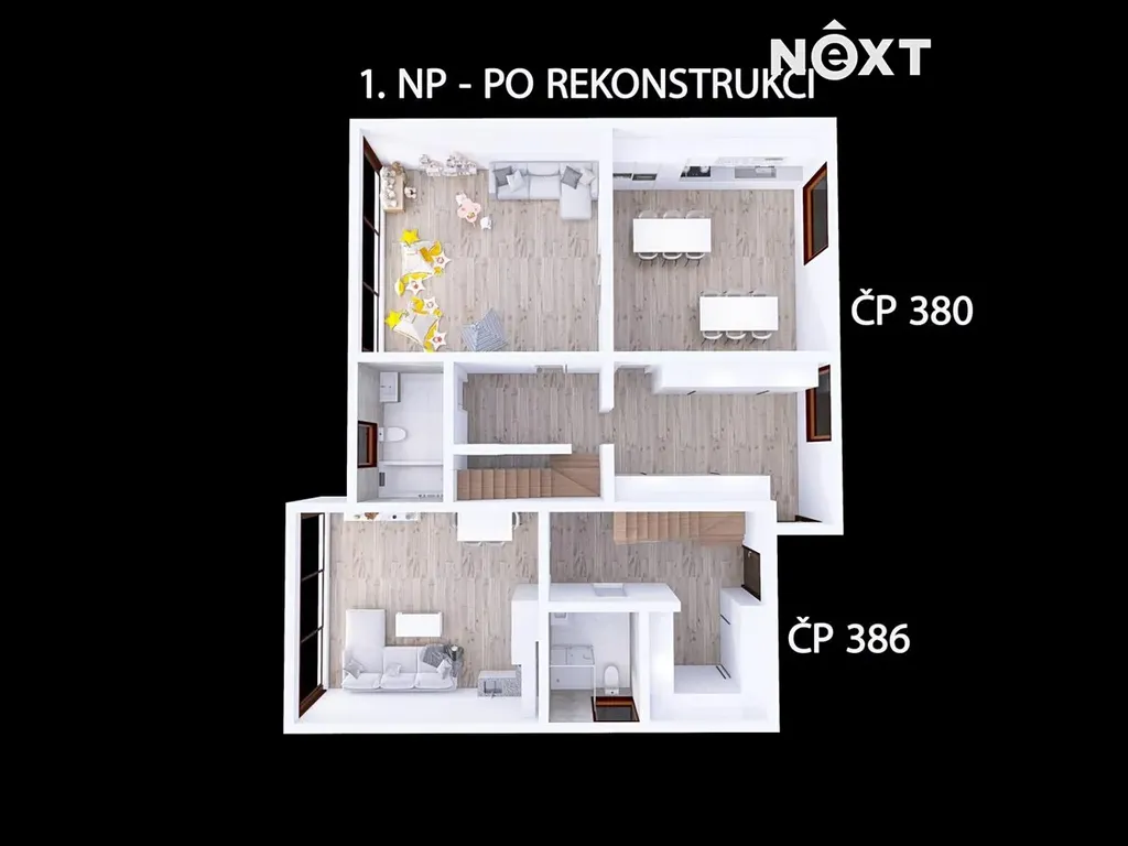 K domu byla zpracována studie na přestavbu ke krátkodobému pronájmu, a pokud byste chtěli celý projekt realizovat, tak jej zpracovatel studie dotáhne i ke zdárnému stavebnímu povolení.