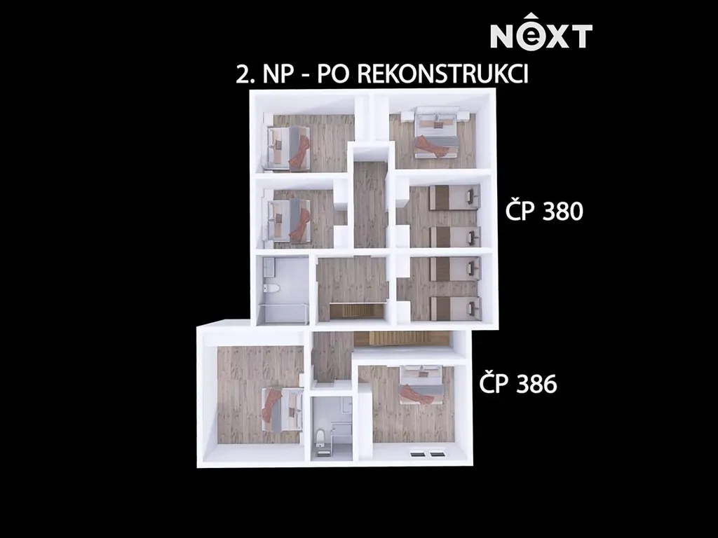 V této místnosti byla plánována dětská hernička pro nejmenší, ale může to být i částečná kombinace s obývacím pokojem, anebo jen obývací pokoj. V 2.NP je samozřejmě opět sociální zázemí a 5 pokojů s kapacitou 12 lůžek plus případné přistýlky pro děti.