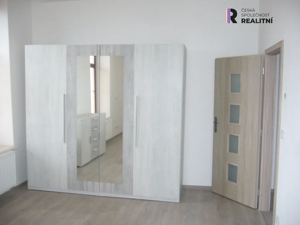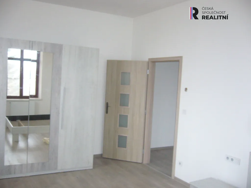 Byt je částečně zařízen nábytkem - postel s rošty bez matrací, komoda, šatní skříň, stůl do jídelny s židlemi.