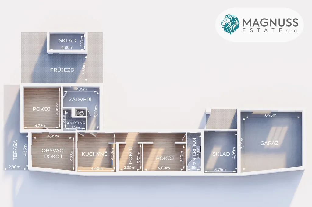 Dispozice 4+1 nabízí dostatek místa pro rodinu, práci z domova i volnočasové aktivity. Každá místnost má svůj charakter a díky modernizacím působí dům útulně a funkčně zároveň.