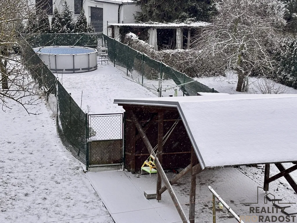 -K bytu náleží oplocená zahrada o výměře 120 m², která nabízí dostatek soukromí. Součástí je také bazén. Z obou ložnic je příjemný výhled přímo do zahrady. Ideální prostor pro relaxaci, grilování nebo hry s dětmi.