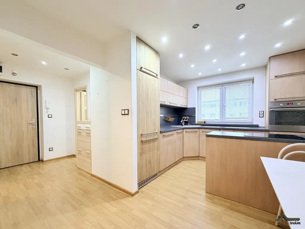 Dominantou bytu je nová moderní kuchyňská linka vybavená spotřebiči a praktickým kuchyňským ostrůvkem, ve kterém je umístěna varná deska a dostatek úložného prostoru. Byt působí vzdušně a současně díky kvalitnímu provedení a promyšleným detailům.