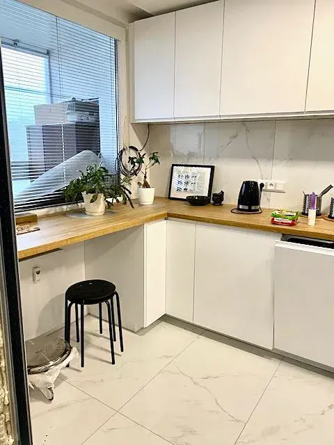 Bytová jednotka prošla v roce 2022 kompletní rekonstrukci. Vstupem do bytu se ocitnete v chodbě (10,5 m2), z které se po levé straně vstupuje do obývacího pokoje 5,4 x 5,4 m (29 m2) a kuchyně 4,3 x 2,1 m (9 m2) s kuchyňskou linkou včetně vestavěných spotřebičů (indukční varná deska, trouba, digestoř, mikrovlnná trouba, myčka nádobí a samostatná lednice). Kuchyň je zároveň průchozí s obývacím pokojem přes dvoukřídlé posuvné dveře. Obývací pokoj je vybaven sedačkou, konferenčním stolkem, kobercem, jídelním stolem se židlemi a nástěnným krbem na bioplyn. Z obývacího pokoje je ještě vstup na lodžií s výhledem do dalekého okolí.