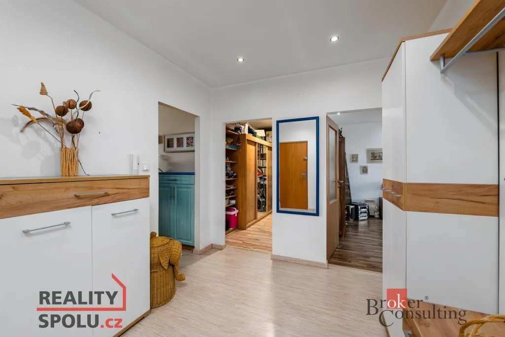 Vstupní chodba tvoří centrální komunikační prostor, odkud je přístup do koupelny, samostatné kuchyně, šatny a obývacího pokoje. Praktická šatna představuje výrazný benefit – nabízí dostatek úložného prostoru a umožňuje udržet obytné místnosti vzdušné a bez nadbytečných skříní. Další úložný prostor nabízí také sklep.