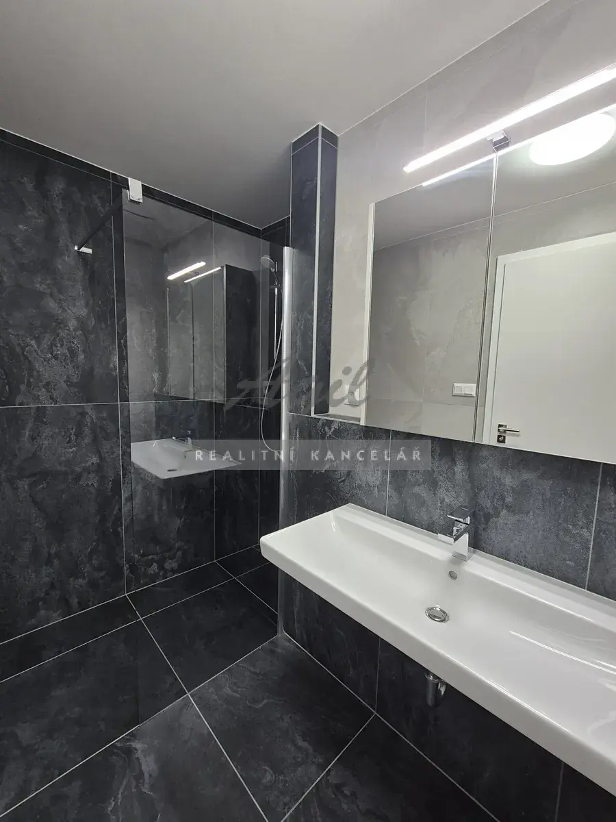 Koupelna – sprchový kout, páková sprchová baterie, umyvadlo s pákovou baterií umyvadlovou, zrcadlo s osvětlením, přípojka na pračku.