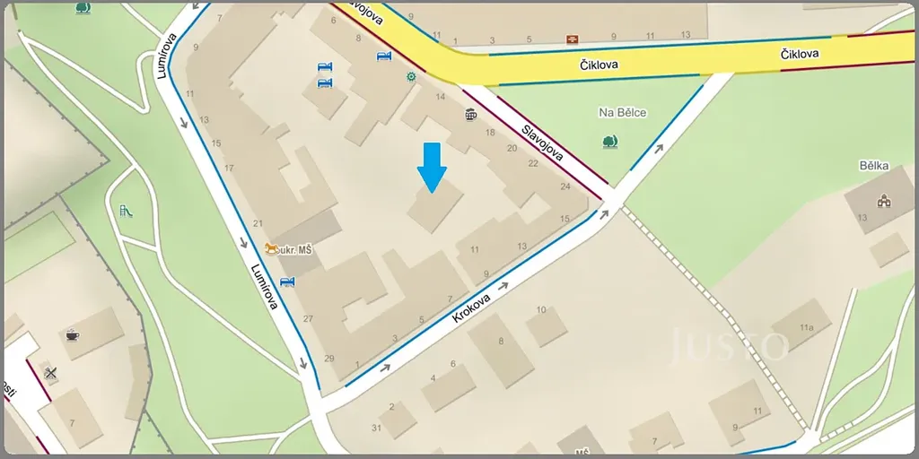 Do 10 minut chůze se nachází stanice metra C – Vyšehrad. Tramvajová zastávka Ostrčilovo náměstí (linky 7, 14, 18, 24) je vzdálena přibližně 5 minut. V okolí je kompletní občanská vybavenost – supermarket Lidl, restaurace, kavárny, obchody, dětská hřiště, menší parky a mnoho dalšího. Pro volnočasové aktivity jsou v blízkosti Lumírovy sady, park Folimanka nebo Vyšehrad. Parkování je možné přímo na ulici v rámci modrých zón, které jsou pro rezidenty bezplatné.