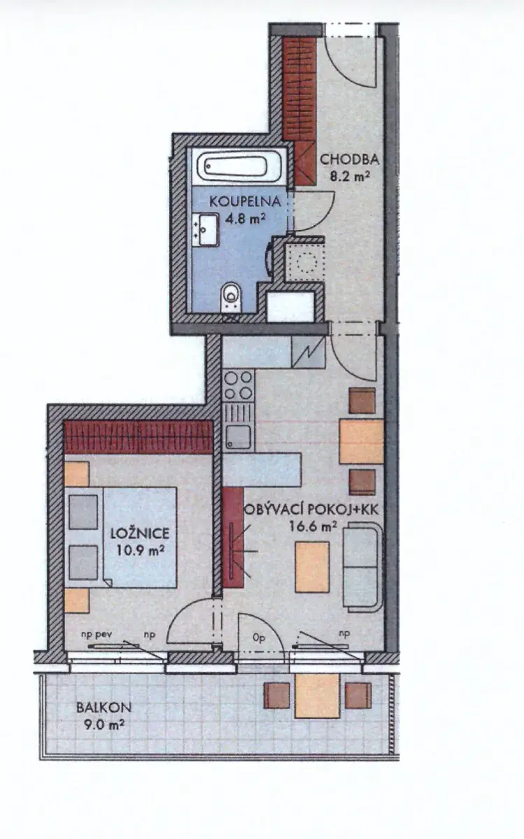 Byt nabízí praktické dispoziční řešení: obývací pokoj s kuchyňským koutem, samostatnou ložnici, vstupní chodbu a koupelnu s WC.