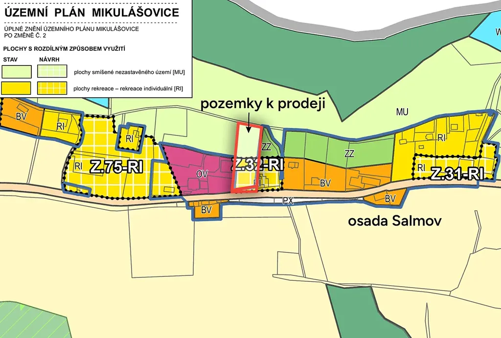 Území tvoří dvě navazující parcely č. 2046/8 a 2070 zapsané na listu vlastnictví 461 v katastrálním území Mikulášovice. Jedná se o 100% podíl, který vlastníkovi umožňuje volné nakládání s pozemky. Přední polovina od cesty je zastavitelná, Postavit se zde dá rekreační chata nebo chalupa, jaké jsou umístěny i na sousedních pozemcích. Zbytek území není určeno k výstavbě, ale sloužit může jako soukromá zahrada, je lemována potokem. Od okolí jsou pozemky nyní odděleny stromy.