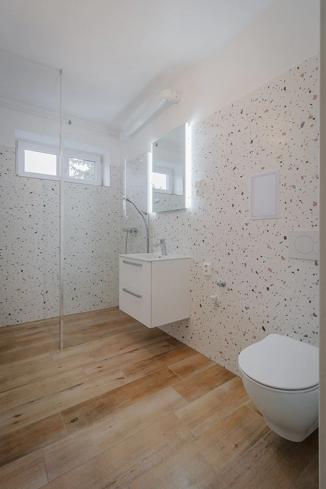 Krásná velká koupelna s nadstandardní velkoformátovou sprchou, otopný žebřík, umyvadlová skříňka se světly a zrcadlem, dostatek místa na pračku, sušičku. Výhodou je okno v koupelně.