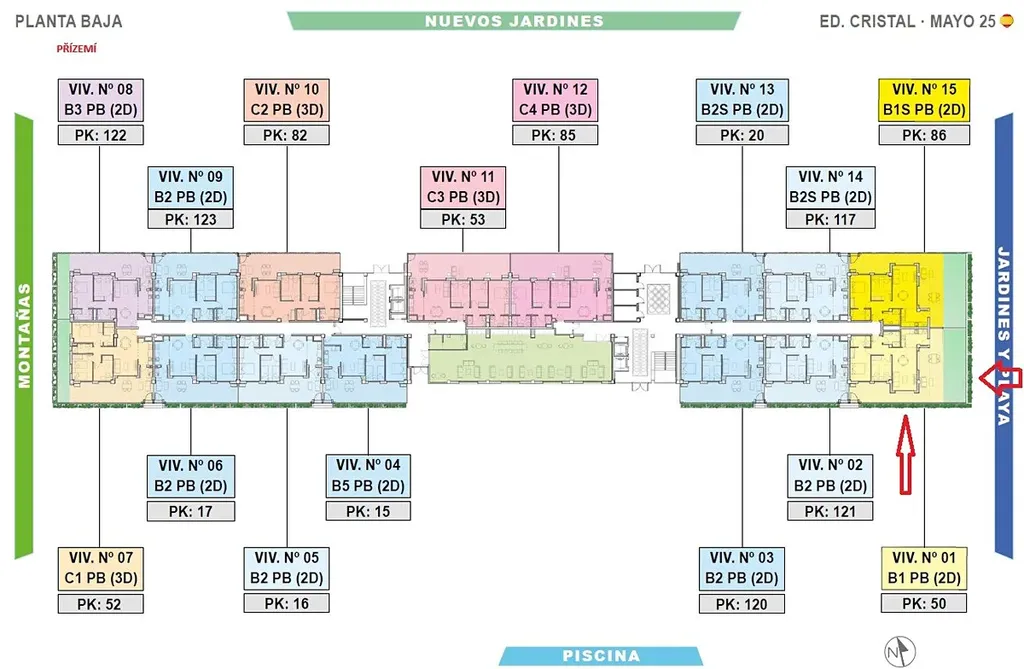 Apartmán s označením SPVCR1_1 se nachází v přízemí budovy a je směřován směrem k blízké pláži. Jde dvouložnicový apartmán se dvěma koupelnami, kuchyňským koutem, obývacím pokojem a velkou terasou s předzahradkou 73 m2. Užitná plocha je 68,6 m2, celková plocha včetně terasy 141 m2. K apartmánu náleží parkovací stání číslo 50 v podzemních garážích.