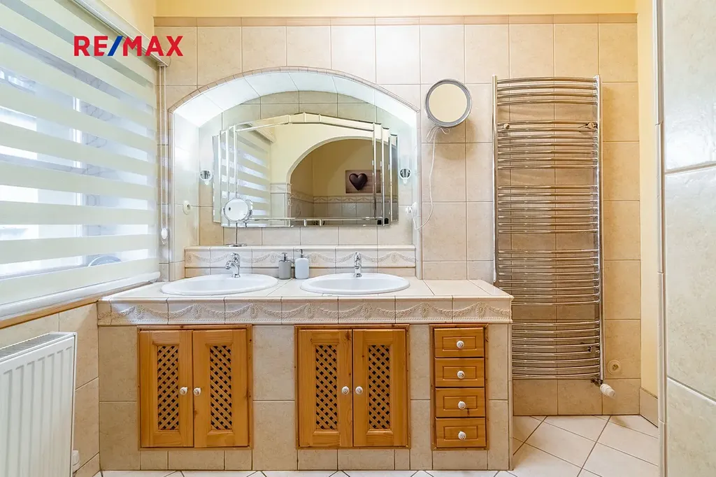 V 1.NP se nachází prostorná hala s krásným smrkovým schodištěm, fitness, technická místnost, ložnice, prádelna, samostatné wc a koupelna s vanou, bidetem a toaletou. Srdcem domu je otevřený prostor obývacího pokoje, kde je dominantou krb s francouzskou vložkou, moderní kuchyní s ostrůvkem a navazující jídelnou, ze které je možnost vejít na terasu. Zde je hotová příprava na zapuštěný bazén a najdeme tady dostatek prostoru k relaxaci a odpočinku.