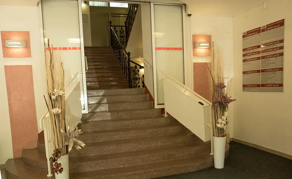 Na podlaží je společné sociální zařízení včetně sprchy a to jak na pánských, tak na dámských toaletách a kuchyňka.