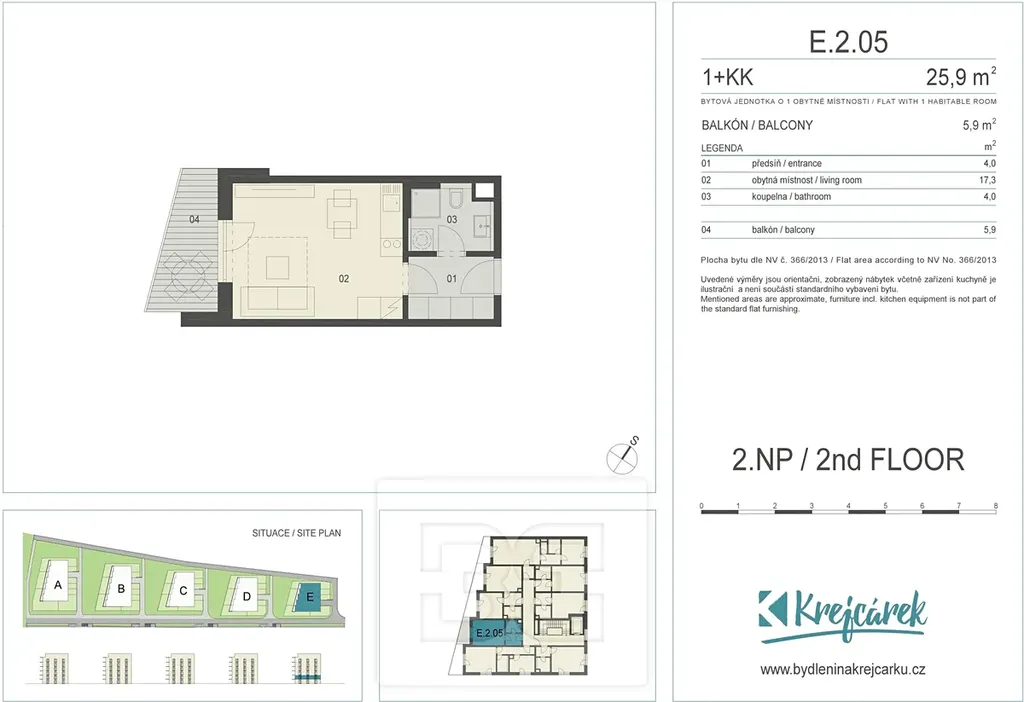 Nabízíme k pronájmu velmi světlý byt o dispozici 1+kk a výměře 26 m², který se nachází ve 2. patře zateplené budovy v moderním rezidenčním projektu Krejcárek (dokončeno v roce 2019).