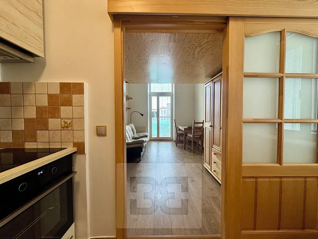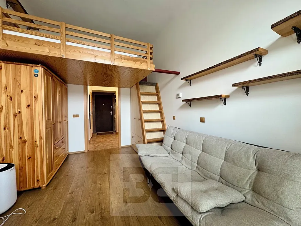 Dispozice bytu nabízí obytný prostor s loftovým patrem na spaní, kde je umístěna postel s novými matracemi. V pokoji se dále nachází gauč a stůl, což vytváří příjemné zázemí pro bydlení i práci z domova. Plně vybavená kuchyně poskytuje vše potřebné pro pohodlné vaření.