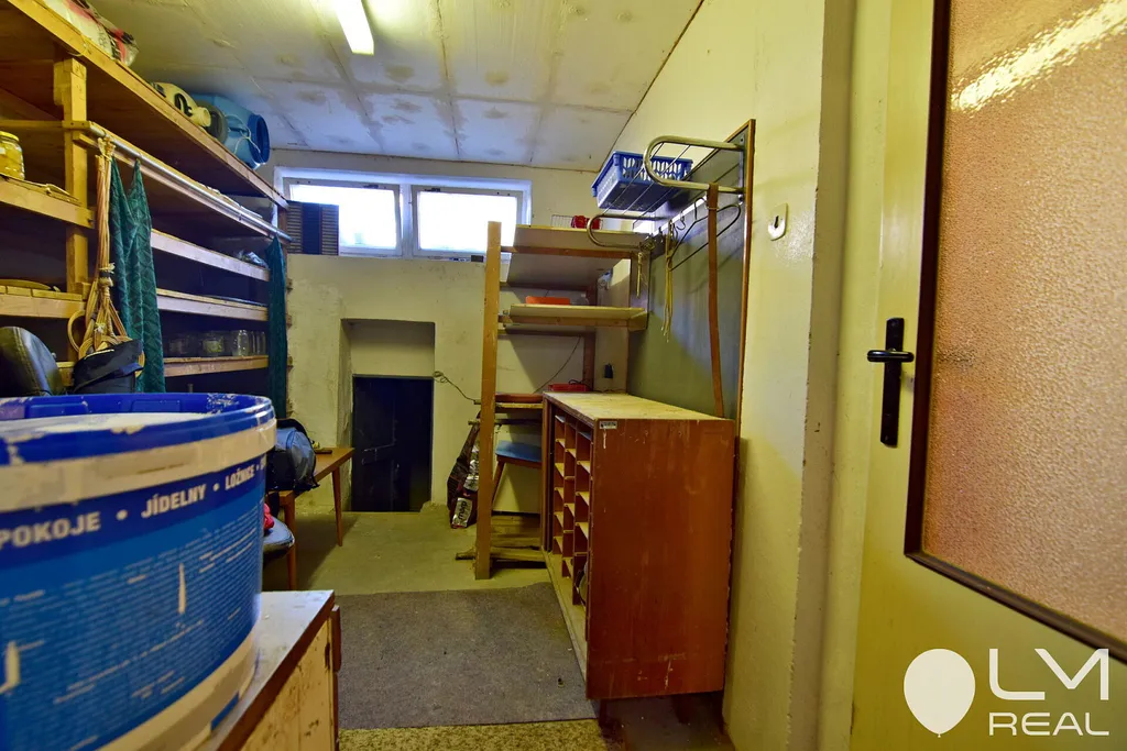 Je podsklepený, má sklady na věci i ovoce a zeleninu, dílnu s praktickými klubovými kamny.