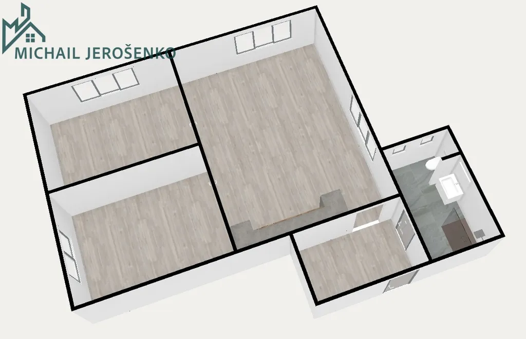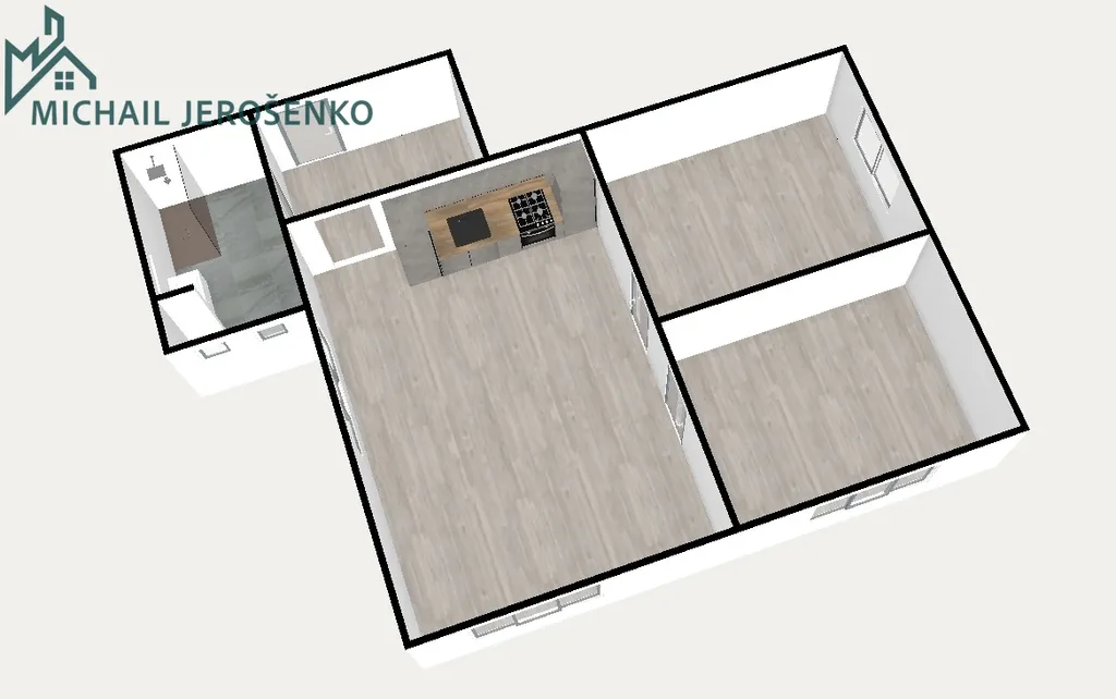 Srdcem bytu je velkorysý obývací pokoj spojený s kuchyňským koutem o rozloze celých 32 m² – ideální prostor pro rodinné večeře, přijímání hostů i každodenní relaxaci. Dva samostatné pokoje o výměře 14 m² každý poskytují dostatek soukromí pro každého člena domácnosti.