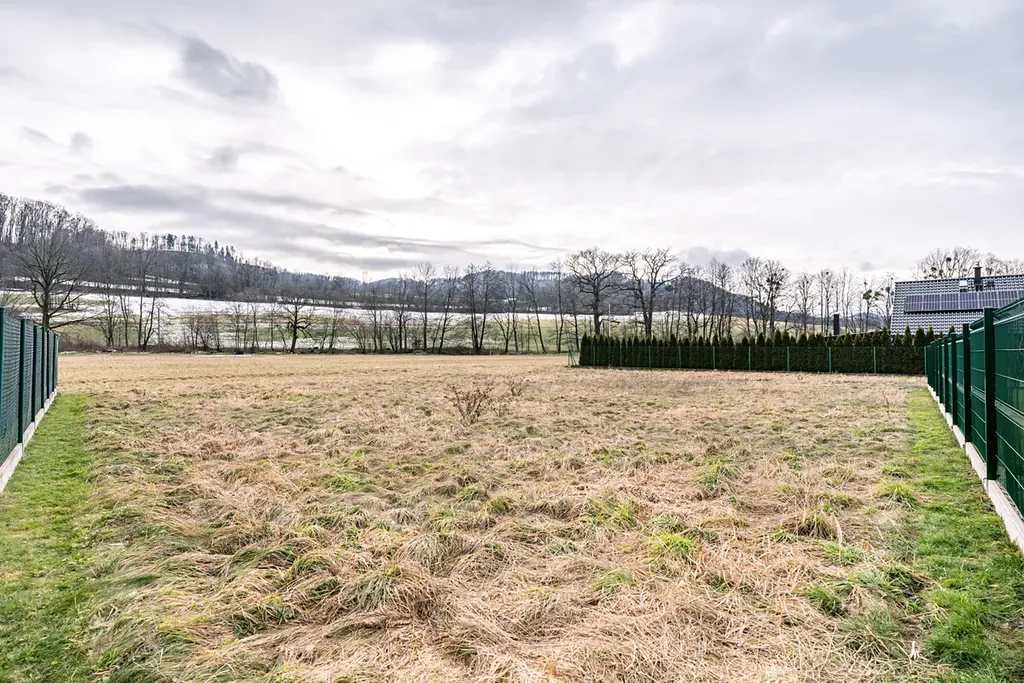 Pozemek je zasazený do klidné zástavby rodinných domů s otevřeným výhledem na louku. Žádný budoucí bytový dům před okny. Jižní orientace zajistí světlo v interiéru po celý den a příjemné večery na terase.