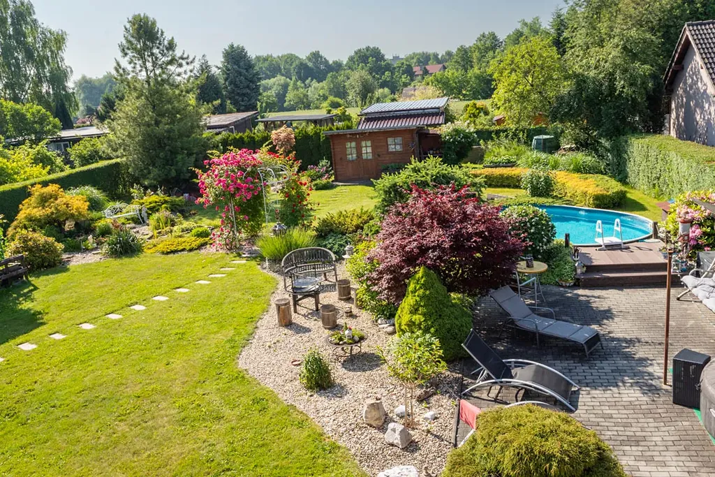 Velkou předností tohoto domu je pečlivě udržovaná zahrada, která nabízí dostatek prostoru pro relaxaci i rodinné aktivity. Najdete zde bohatou výsadbu květin, keřů a stromů, zahradní posezení i bazén.